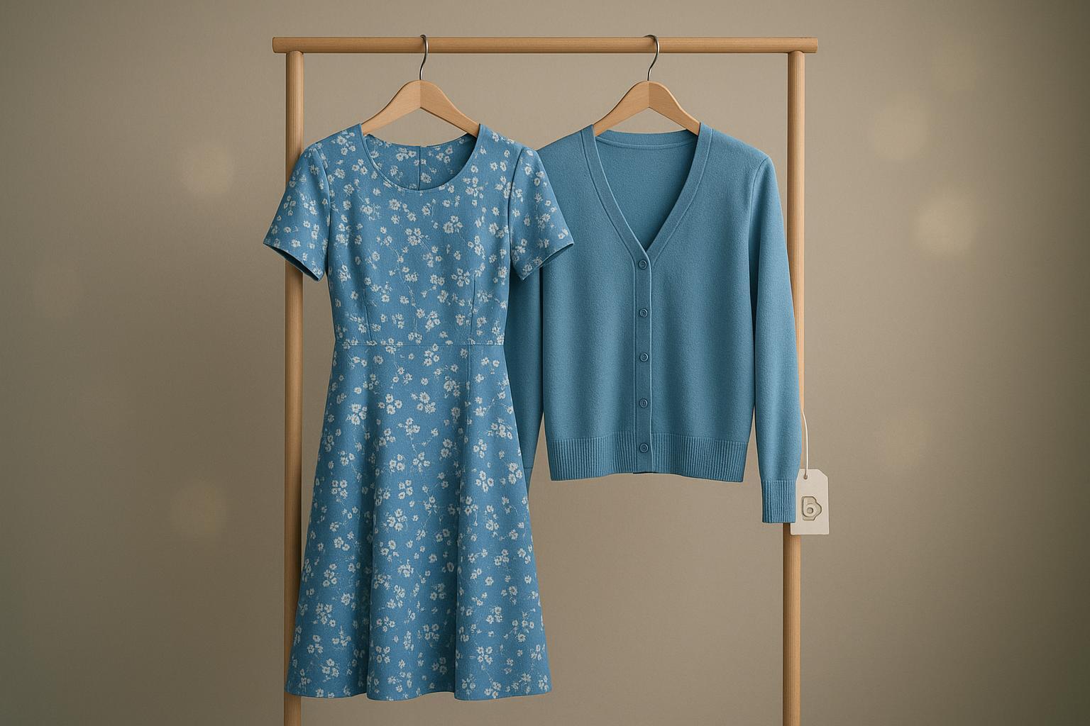 Caption: A quick swatch check—matching the dominant blue code across the dress print and the cardigan—helps flag shade drift before you place a multi‑size order.