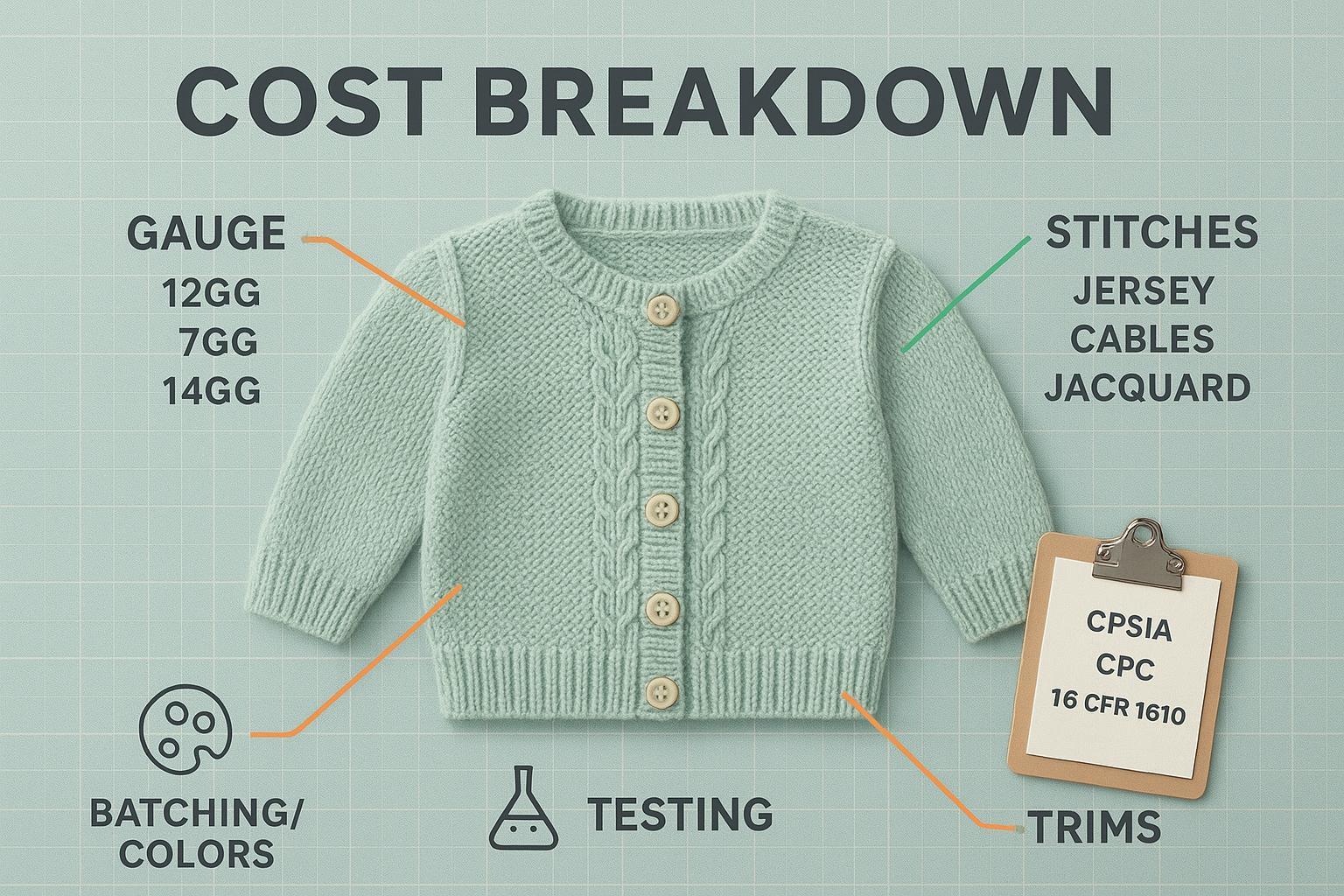 Launching a baby knitwear capsule on a 50–80 piece color run sounds simple—until you cost it. This guide shows exactly how the CPSIA framework, gauge and stitch choices, and low-MOQ realities flow into your per‑unit price. We’ll use three baseline SKUs, a textile‑only compliance plan (16 CFR 1610 + CPC + tracking labels), and one practical savings lever: batching colors/lots and consolidating gauges where permissible.