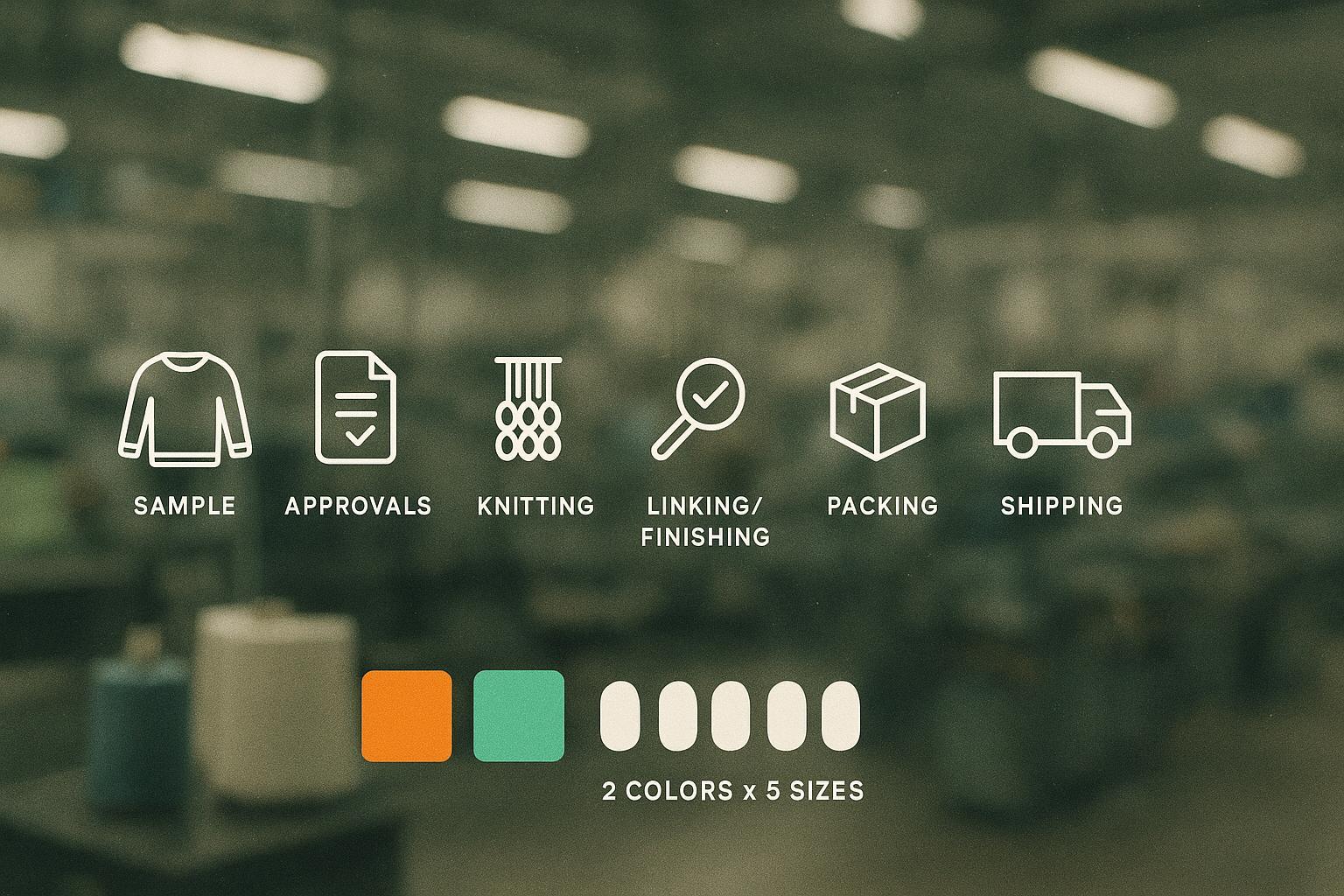 Planning a small-batch sweater run with two colors across five sizes? This FAQ lays out realistic MOQs, timelines, and what changes when you choose stock-service yarn versus yarn-dyed/custom colors. The answers assume basic stitches, two colors × five sizes, and low-MOQ production, with notes where WHOLEGARMENT complexity adds time.