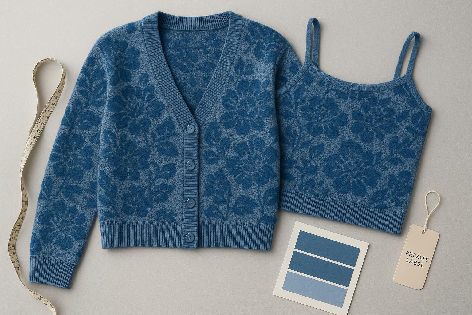 A candid, operations-first look at Xindi Knitwear’s private-label capability for a blue floral jacquard midi cardigan set (cardigan + camisole).